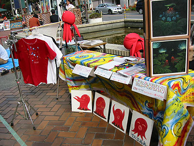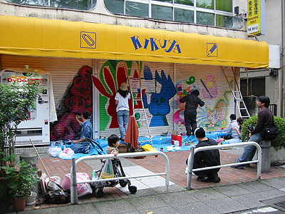 岡本太郎作「呼ぶ赤い手青い手」の修復チャリティアートイベントとして開催されたアートフェスタロウに参加。 イベントの一環として、文房具屋さんのシャッターを6人で描く。