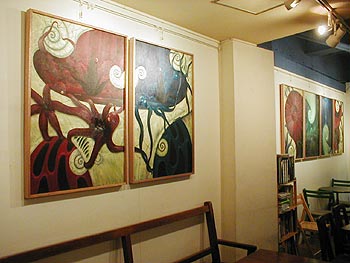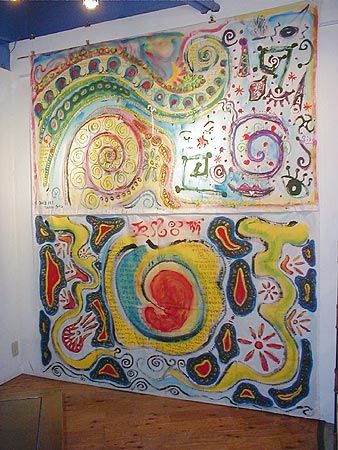個展初日に会場で、つだ♀まさごろと2人でライブペインティングを行った。上半分がその作品。下半分は、6月に高田馬場PHASEで開催された井草幹企画による企画ライブ「193世界」のライブ中に、演奏を聴きながらライブペインティングしたもの。
