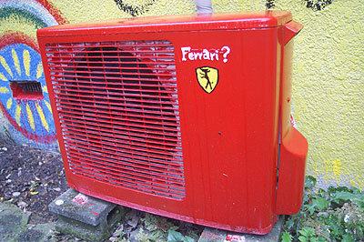 室外機1号。真っ赤に塗ってみたらフェラーリに見えてきたので、えせエムブレムを入れてみた。