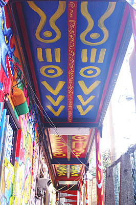1階通路天井。どこかの神殿風にしようとタコ文字を入れてみる。もっとみっちり描き込みたかったが、ずっと上を向いて描くというのが想像以上にきつい。時間的にも体力的にも、これが限界であった。
