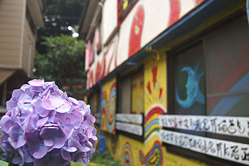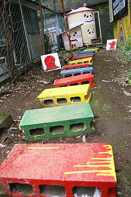 裏庭。外壁を描くついでに庭も整備。お客を裏庭へ呼ぶにはあまりに汚かった。雨が降るとドロドロなので庭に転がっていたブロックに色を塗って並べてみた。