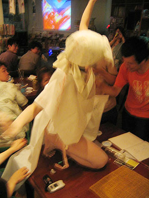 舞踏家の南阿豆とタコテルミンによるコラボ。まったくリハも無しのぶっつけ本番。会場を踊り歩きながら、衣装に絵を描いてもらう。面白い試みだ。